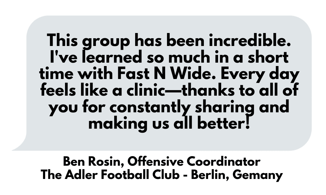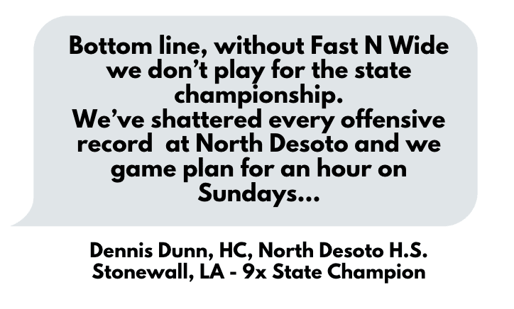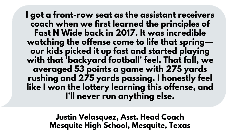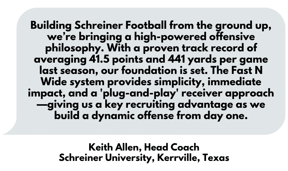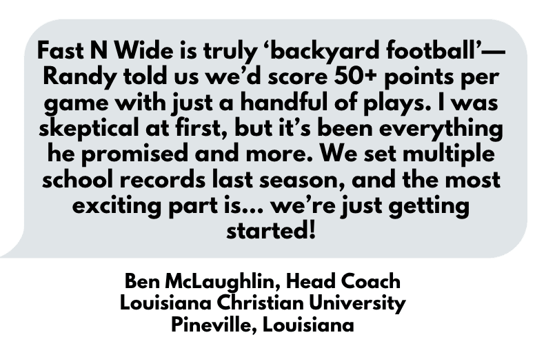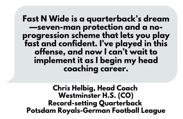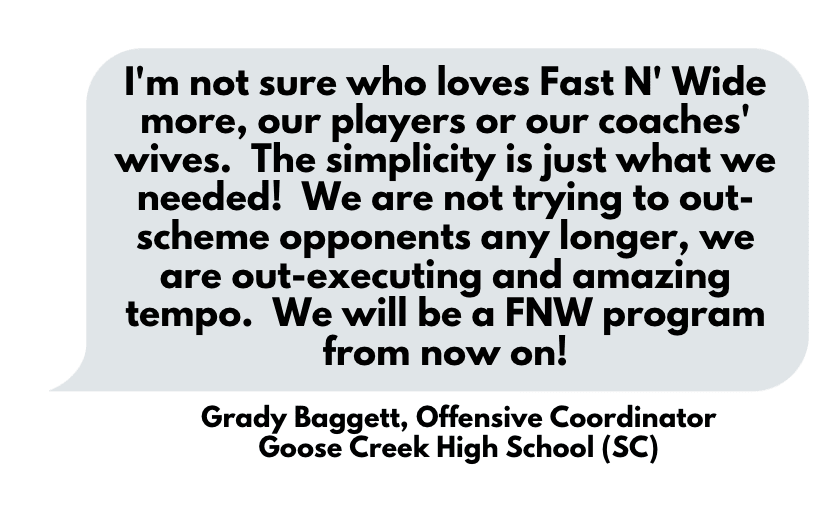 "Fast N Wide is a game changer because of its simplicity and relentless execution. Coaches all over the world are trusting tempo and the ‘law of the field’ instead of beating their heads against the wall every weekend trying to outsmart the defensive coordinator across the field. This system creates stress through alignment, spacing, and speed—not complexity. It’s about playing fast, being efficient, and winning with clarity. You don’t need more plays—you need better execution. That’s the power of Fast N Wide."